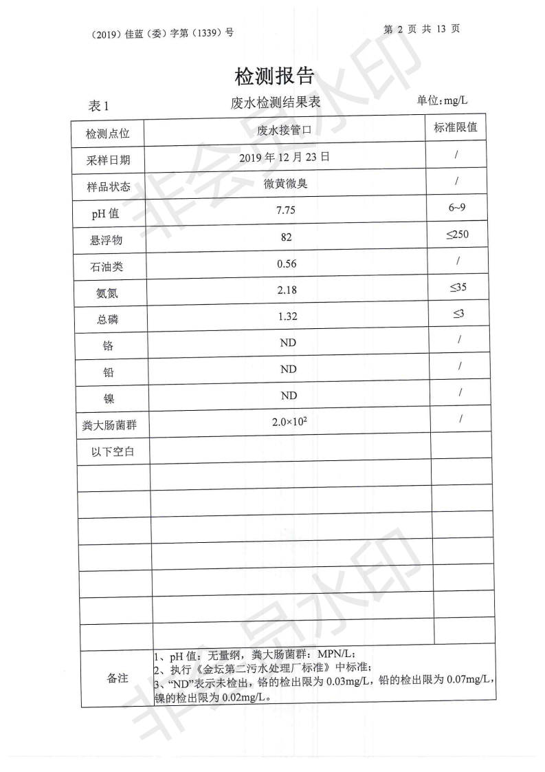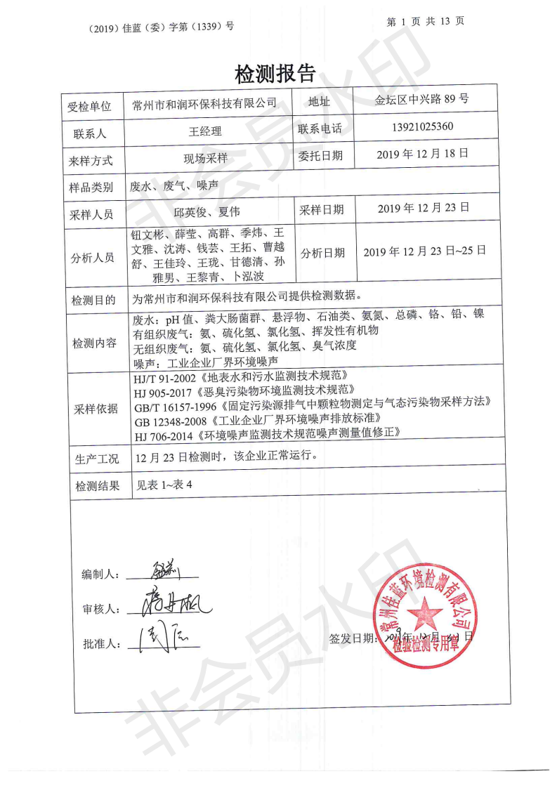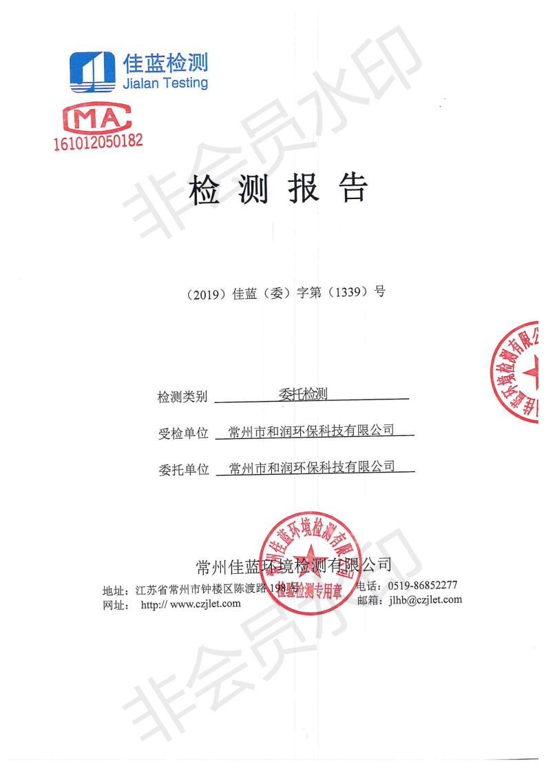 2019年12月我司委托常州佳藍環境檢測有限公司對本司廠區范圍內的廢水、有組織廢氣、無組廢氣、噪聲等進行檢測并提供檢測數據,檢測時,本司正常生產運行。以下為常州佳藍環境檢測有限公司提供檢測報告。
